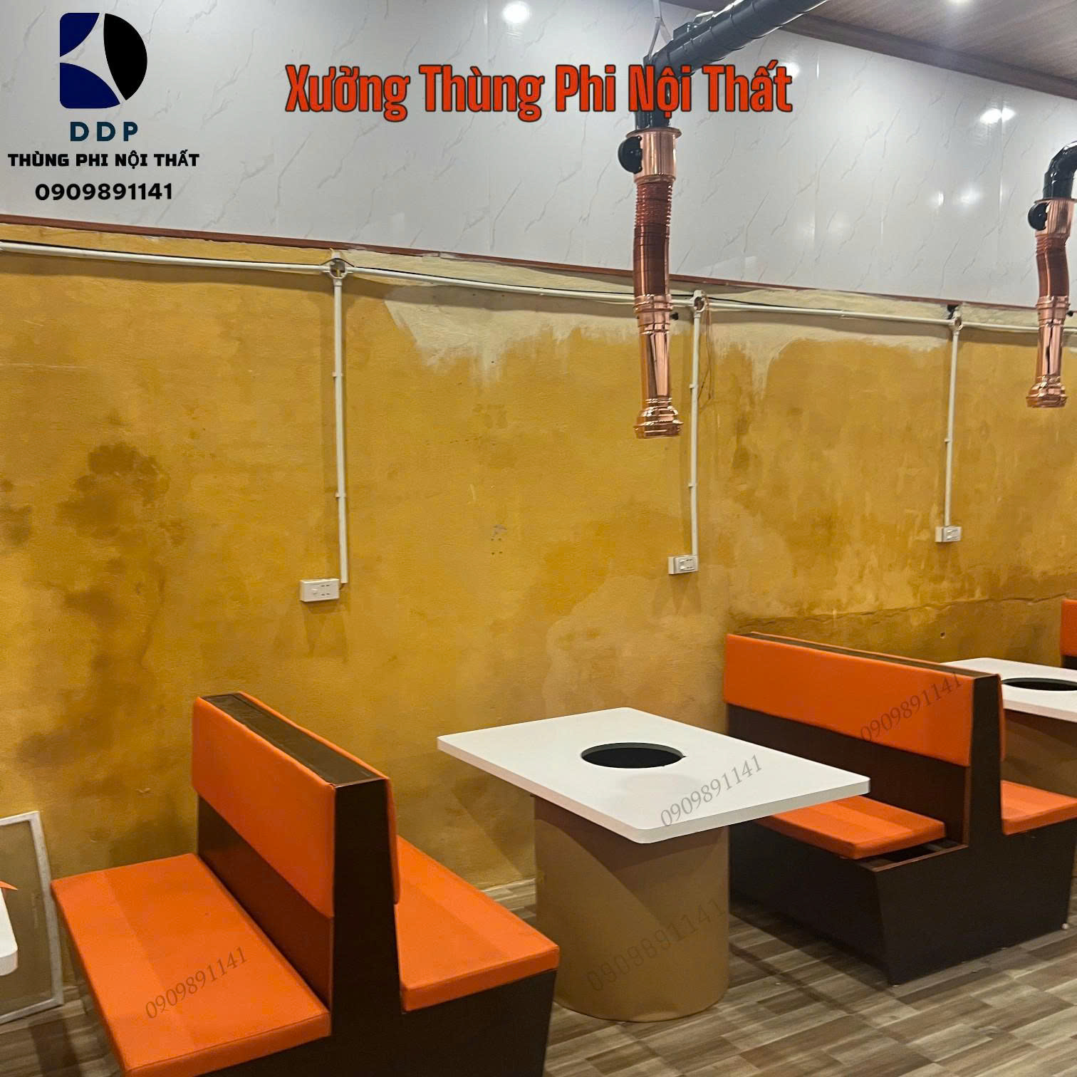 Bàn nướng thịt là loại bàn được thiết kế để gắn bếp nướng trực tiếp trên mặt bàn, cho phép khách tự nướng đồ ăn ngay tại chỗ. Vì phải hoạt động liên tục ở nhiệt độ cao, bàn nướng cần có khả năng chịu nhiệt tốt, hạn chế ám mùi và đảm bảo an toàn trong suốt thời gian phục vụ.