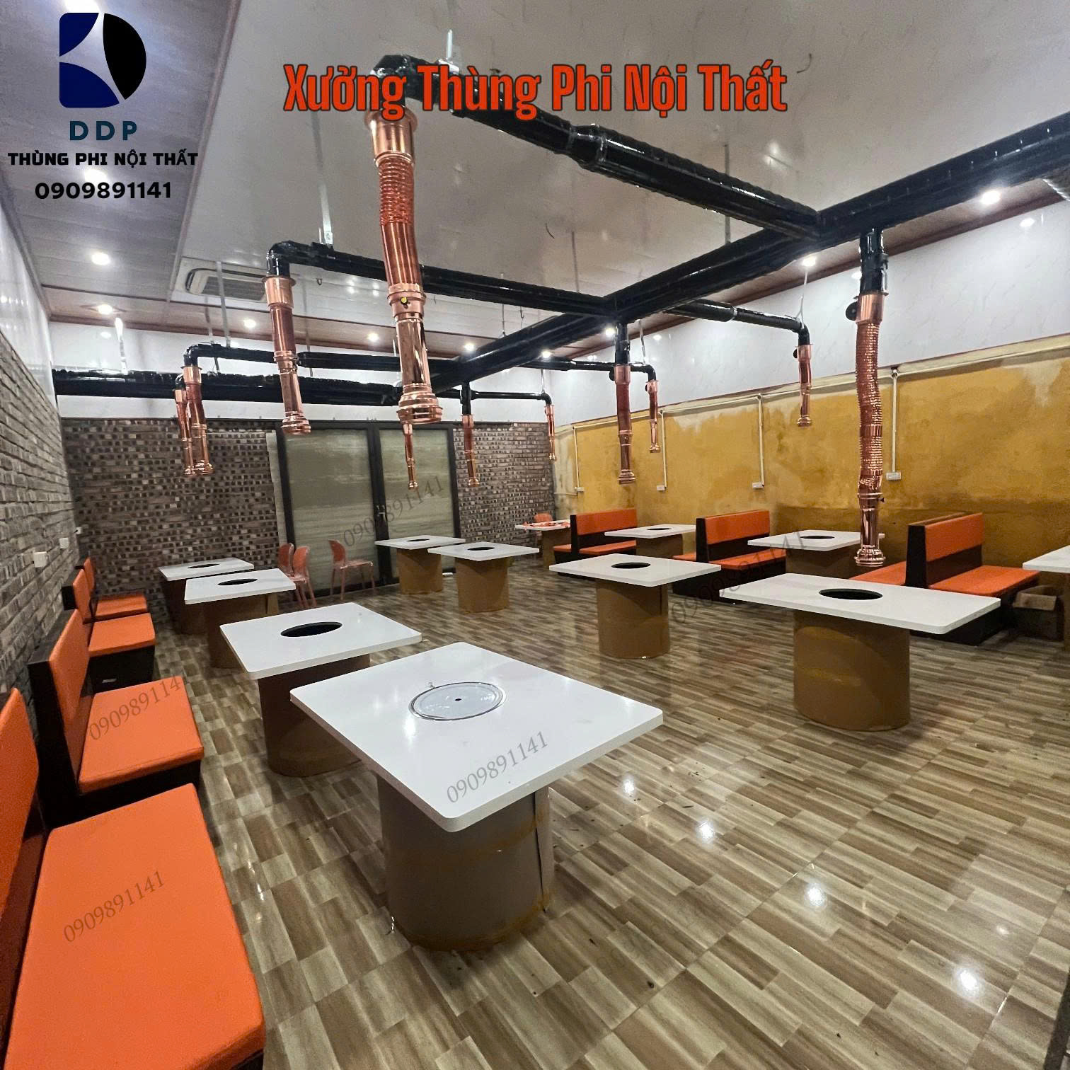 Ở phân khúc bình dân, bàn nướng thùng phi luôn là lựa chọn quen thuộc vì thiết kế chắc chắn, giữ nhiệt tốt và tạo được cảm giác gần gũi cho khách. Thân thùng cong giúp nhiệt lan đều, than cháy ổn định và không đòi hỏi hệ thống hút khói phức tạp. Quán có thể bố trí nhiều bàn trong không gian nhỏ mà không ảnh hưởng đến tốc độ phục vụ. Nhờ sự đơn giản và bền bỉ, bàn thùng phi phù hợp với quán đông khách, cần nướng nhanh và dễ thay thế phụ kiện.