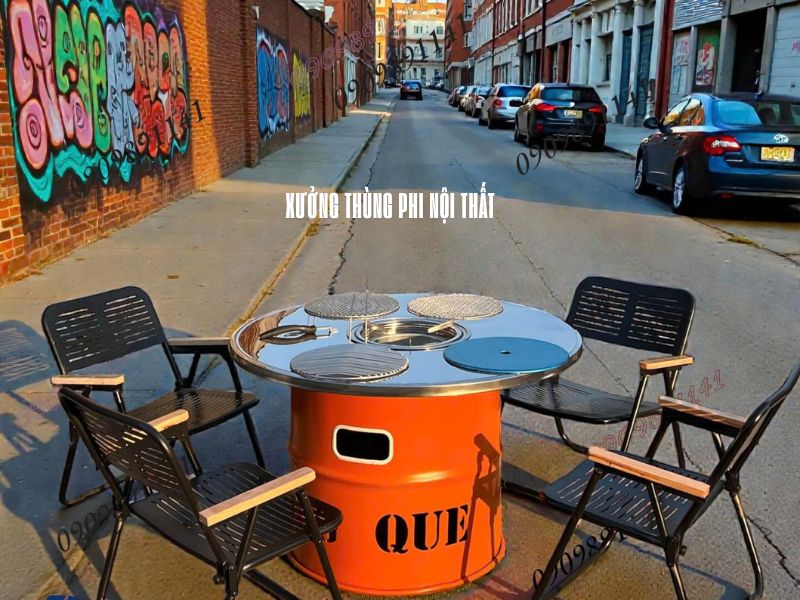 Bàn thùng phi cắt nửa có kiểu dáng gọn gàng hơn, giúp tiết kiệm diện tích nhưng vẫn giữ được nét cá tính đặc trưng. Mẫu bàn này phù hợp với các quán có không gian vừa và nhỏ hoặc khu vực vỉa hè cần bố trí linh hoạt.